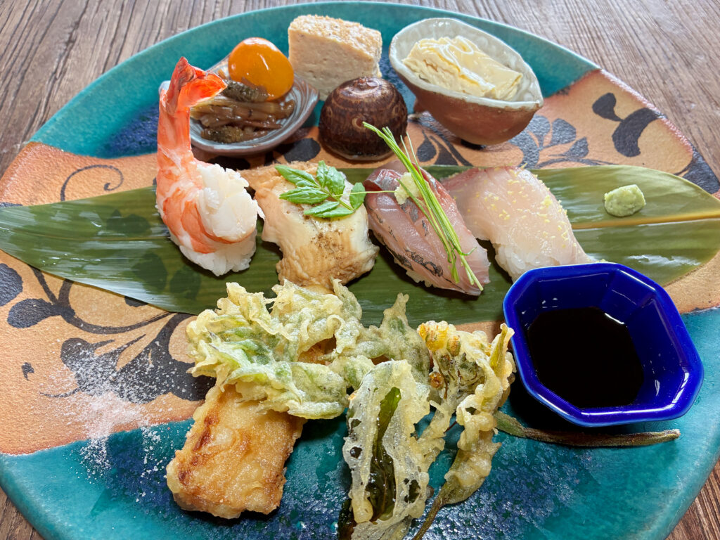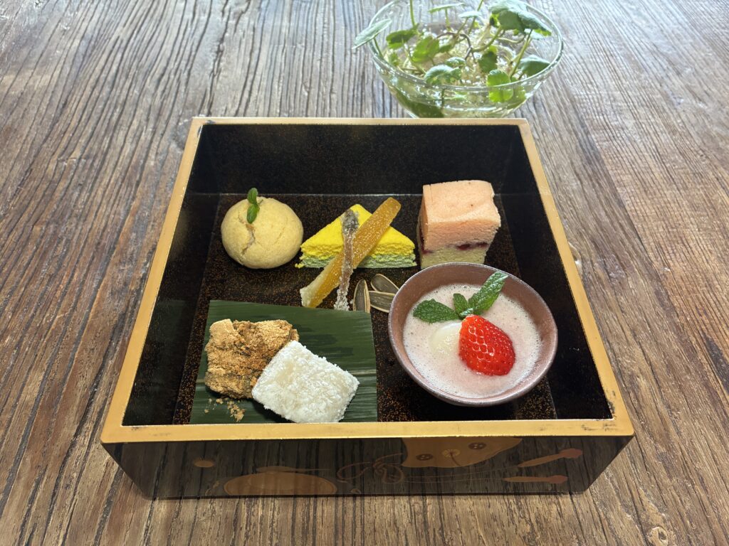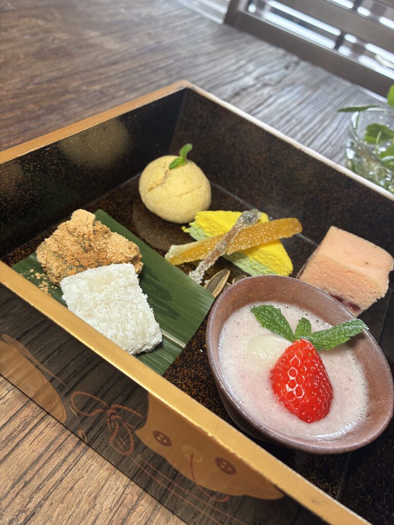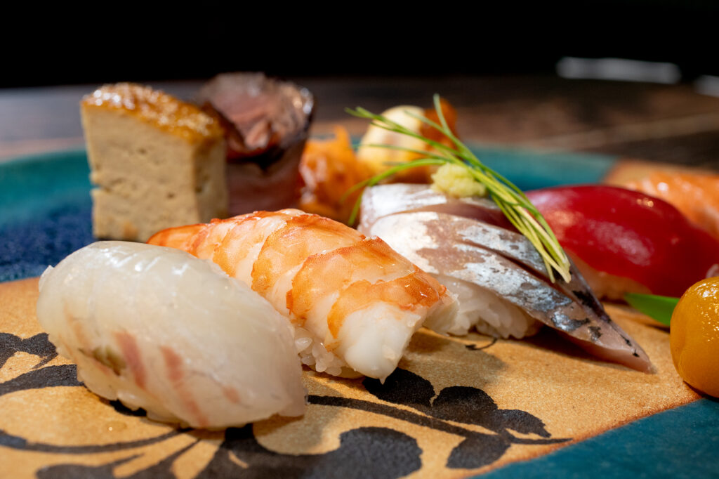 お食事部分は、季節の前菜と握り寿司5貫。旬のネタに京風シャリを合わせたお寿司は、贅沢そのものです。季節のお椀も付いて、ちょうどよくお腹が満たされたところで、いよいよメインイベントの「お菓子LIVE」がスタート!