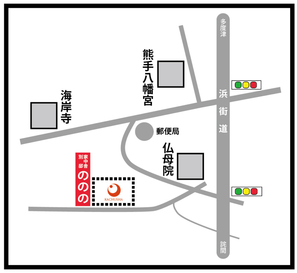 熊手八幡宮、仏門院、そして海岸寺。弘法大師ゆかりの三寺社に抱かれるように佇むのは、築百年の息吹を今に伝える古民家「家中舎 別邸ののの」です。